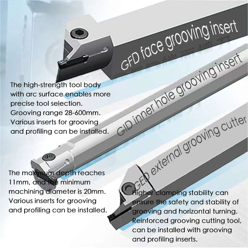 Reinforced grooving tool, can be installed with grooving, profiling and other kind of inserts .