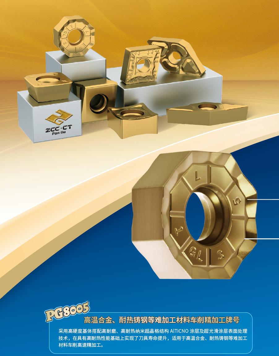 適合難加工材料高效加工的PG8系列數(shù)控刀片牌號(hào):PG8系列牌號(hào)采用高硬度基體搭配高耐磨、高耐熱納米超晶格結(jié)構(gòu)涂層以及超光滑涂層表面處理技術(shù),適用于高溫合金、耐熱鑄鋼等難加工材料。PG8005搭配NGF,SNR車(chē)削槽型分別用于難加工材料的高效車(chē)削精加工。PG8020、8030搭配FMA12、EMP09、FMP17等銑削刀具用于難加工材料的面銑、方肩銑以及仿型銑等加工。