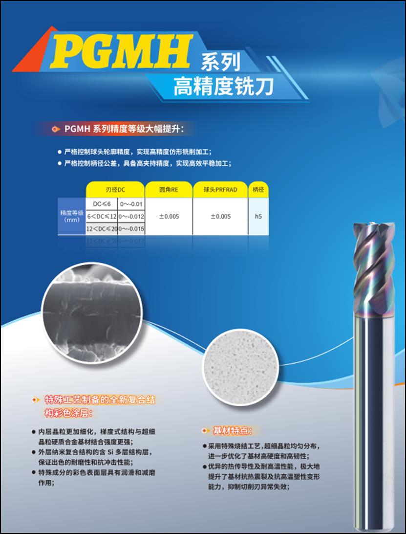 適合高硬度高精度加工的PGMH整體硬質(zhì)合金銑刀:PGMH系列采用特殊燒結(jié)工藝,超細(xì)晶?;?,具有更好的熱傳導(dǎo)性和耐高溫性能,在高速高效加工過程中具備更好的抗熱震裂及抗高溫塑性變形性能;采用全新復(fù)合結(jié)構(gòu)彩色涂層,內(nèi)層的晶粒更細(xì),梯度式結(jié)構(gòu)與超細(xì)晶粒硬質(zhì)合金基體的結(jié)合強(qiáng)度高;外層采用納米復(fù)合結(jié)構(gòu)多層結(jié)構(gòu),保證了出色的耐磨性和抗沖擊性能;特殊彩色表面層,具有更好的潤滑和減磨作用,辨識度高;在結(jié)構(gòu)方面采用大芯厚高剛性設(shè)計(jì),保證在大參數(shù)切削環(huán)境下加工過程的平穩(wěn)。