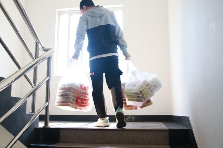 后勤保障組主要負(fù)責(zé)全體人員的餐飲無(wú)接觸配送、采購(gòu)物資的分發(fā)等。每日訂餐結(jié)束后,志愿者從后臺(tái)導(dǎo)出訂餐人員信息,整理出每樓層的總訂餐數(shù)、房間號(hào)及份數(shù)清單,為餐食的分發(fā)提前做好準(zhǔn)備。志愿者取餐后按清單快速分揀各樓層所需餐食,各樓層餐食分配完成后,統(tǒng)一通知開門取餐,極大的減少了員工之間的接觸,大幅提高了配餐的效率,確保員工可以吃上熱乎的午餐和晚餐。目前每日送餐量接近400份,單樓層最大配送量超過80份,經(jīng)過配送流程優(yōu)化后,每層在5-8min即可完成無(wú)接觸送餐,效率大大提高。