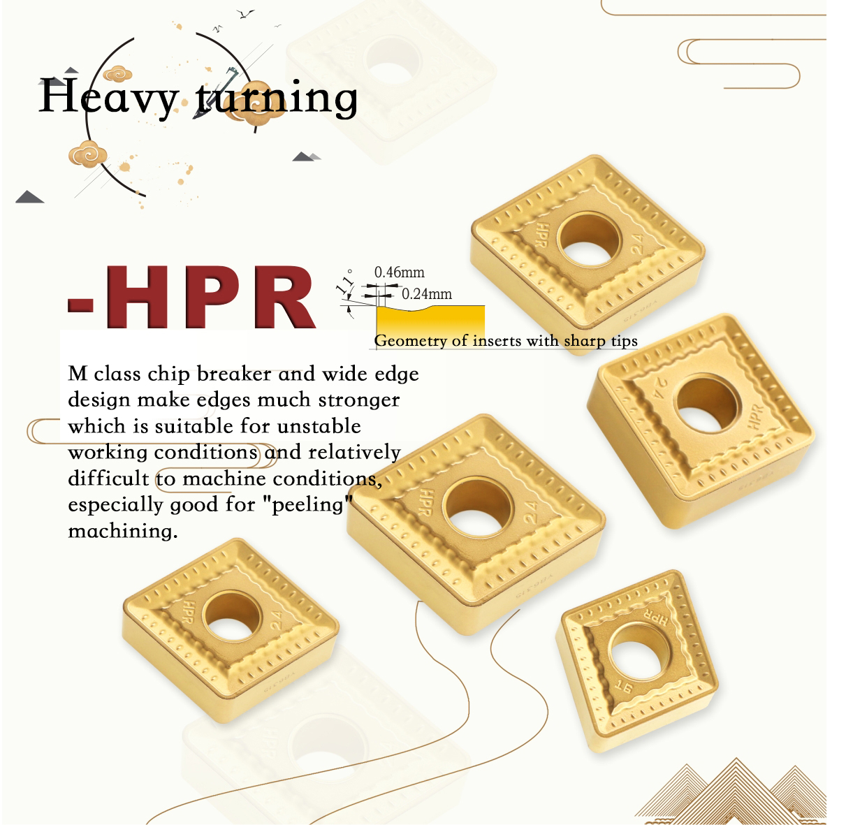-HPR M class chip breaker and wide edge design make edges much stronger which is suitable for unstable working conditions and relatively difficult to machine conditions, especially good for"peeling" machining.