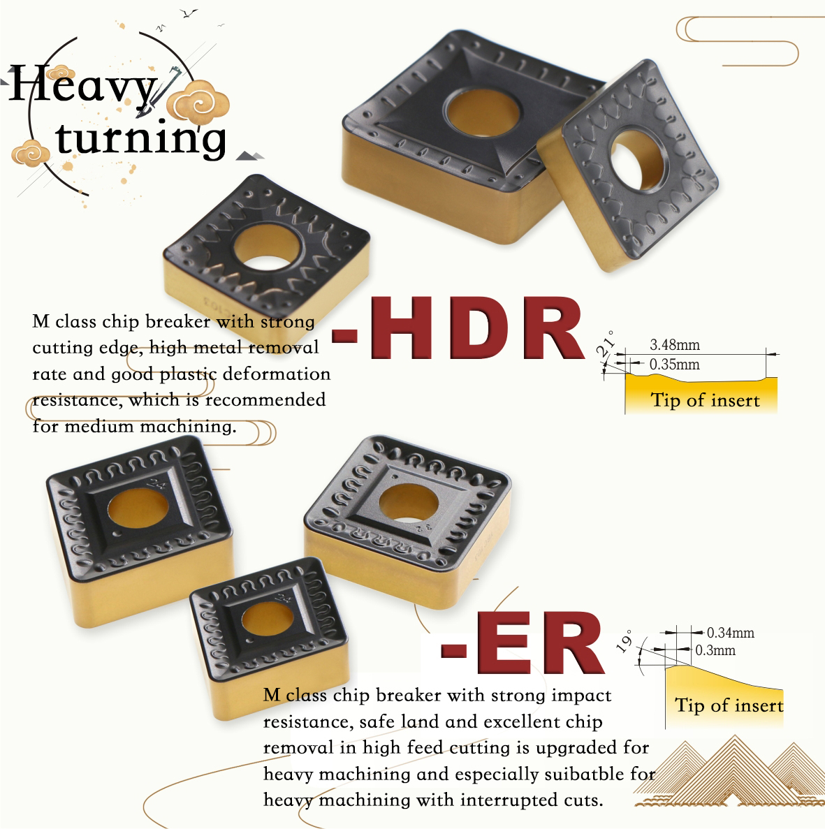 -HDR M-class chip breaker with strong cutting edge, high metal removal rate and good plastic deformation resistance, which is recommended for medium machining.