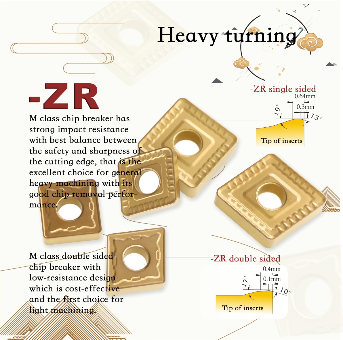 -ZR M-chip breaker has strong impact resistance with best balance between the safety and sharpness of the cutting edge, that is the excellent choice for general heavy machining with its good chip removal performance,