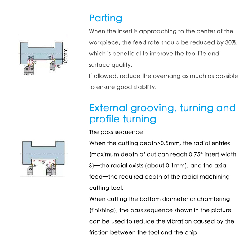 The axial turning depth doesn’t exceed 0.75*S (the width of the insert edge),and the groove width is greater than the groove depth, When The groove depth is greater than the groove width as shown in the figure(2), the multi-slot cutting is recommended.